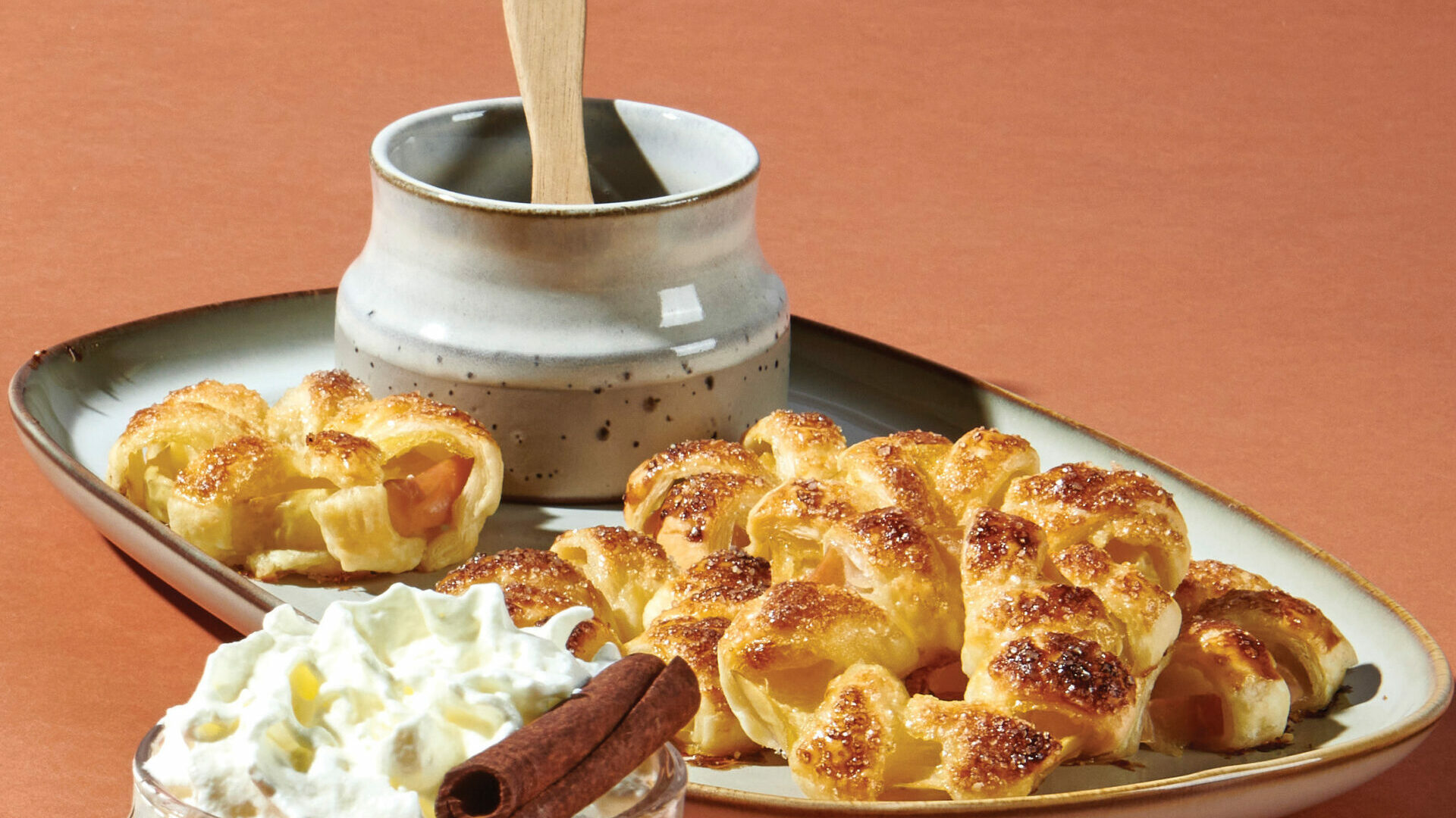 Leg de bladerdeeghapjes op een bakplaat bedekt met bakpapier. Zet 20 minuten in een oven voorverwarmd op 180°C