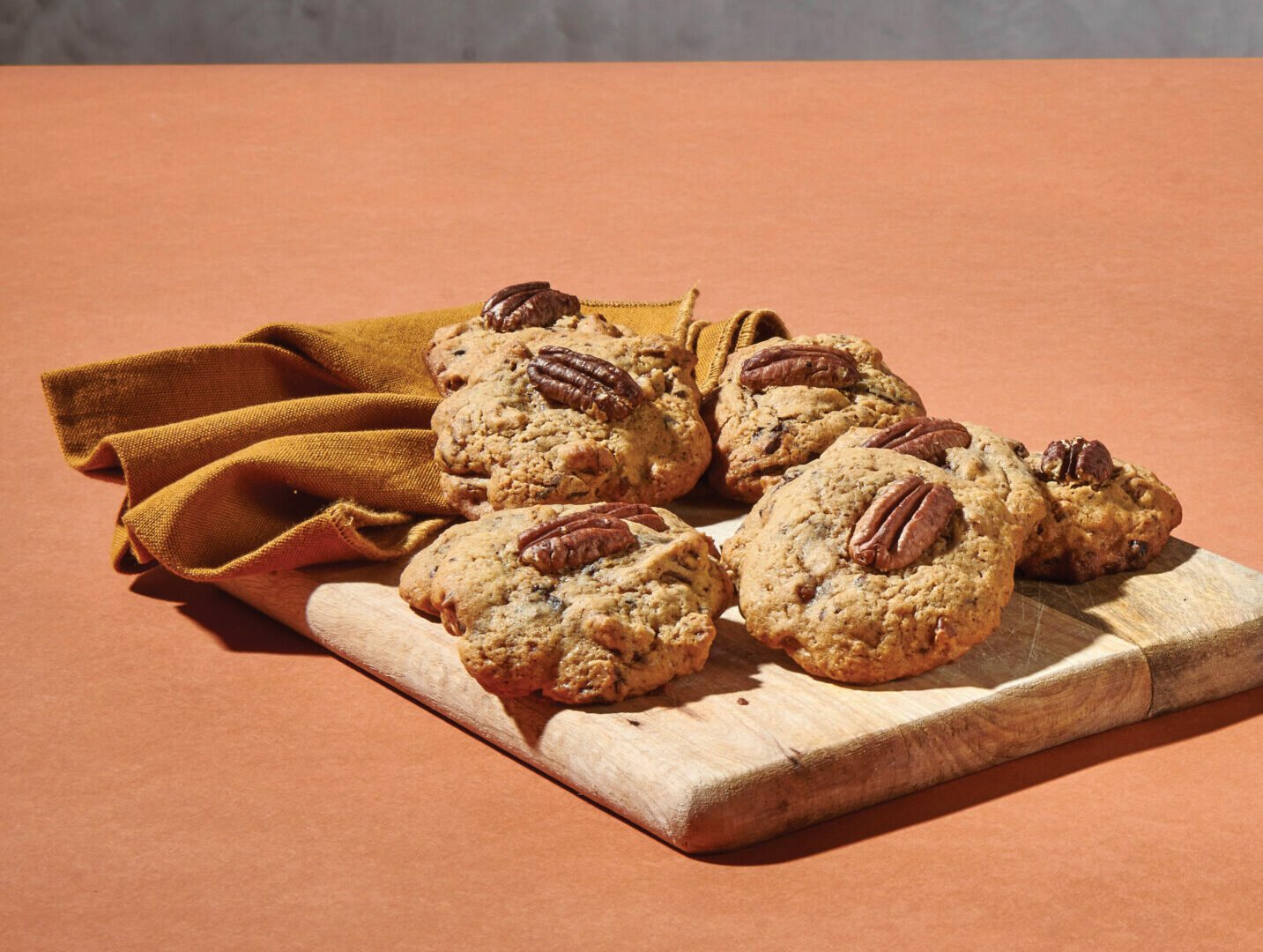 Maak balletjes met het deeg en leg ze op een bakplaat bedekt met bakpapier. Leg op elke cookie een pecannoot en een snufje fleur de sel.