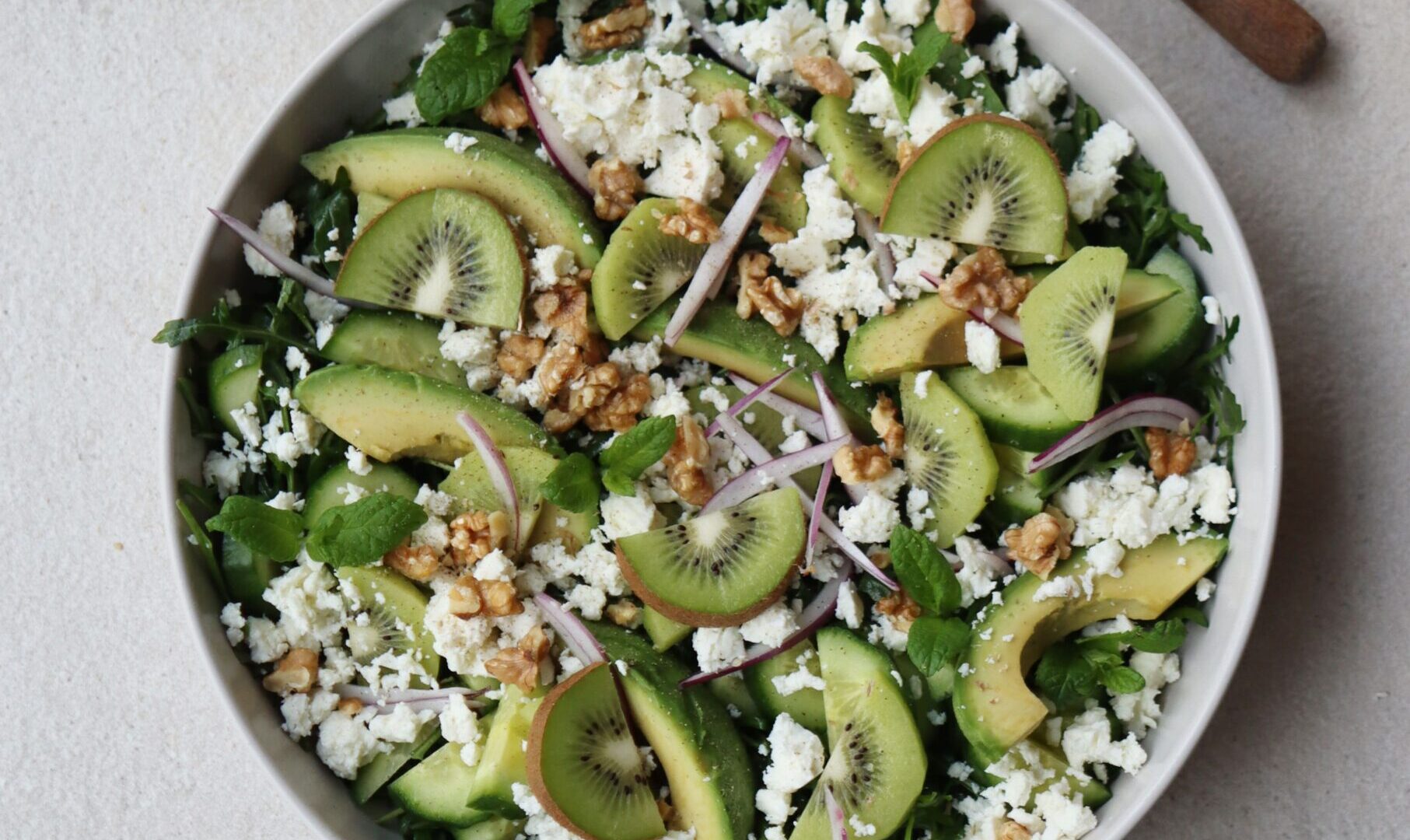 Voeg de in stukjes gesneden kiwi, komkommer, avocado en rode ui toe.