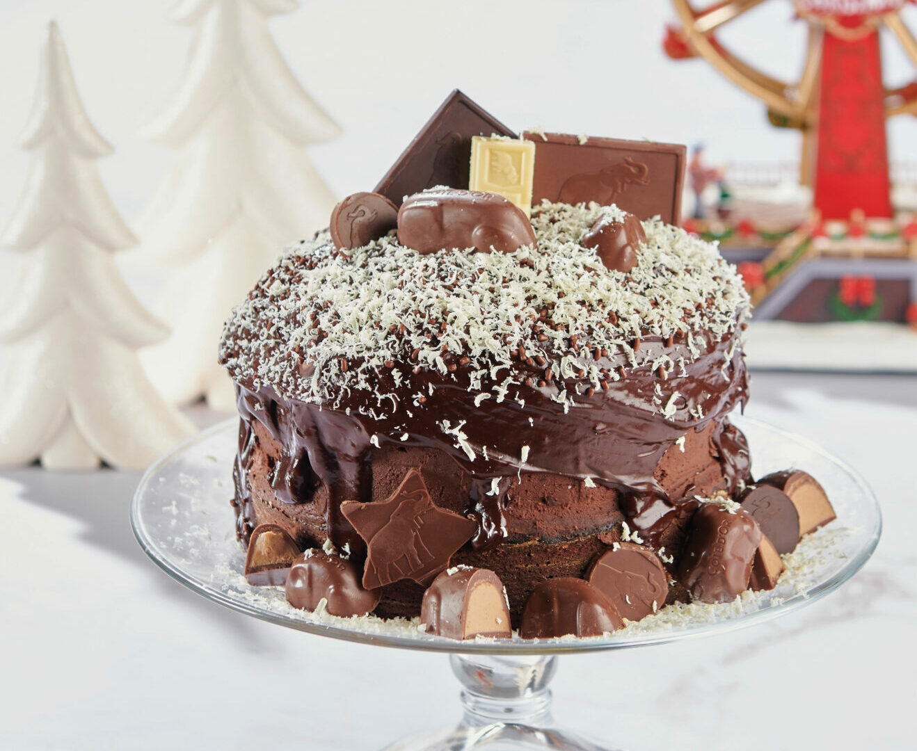 Chauffez la crème et le beurre. Versez-les sur le chocolat haché et mélangez jusqu’à l’obtention d’une texture lisse. Nappez le gâteau avec le glaçage et laissez couler sur les bords.